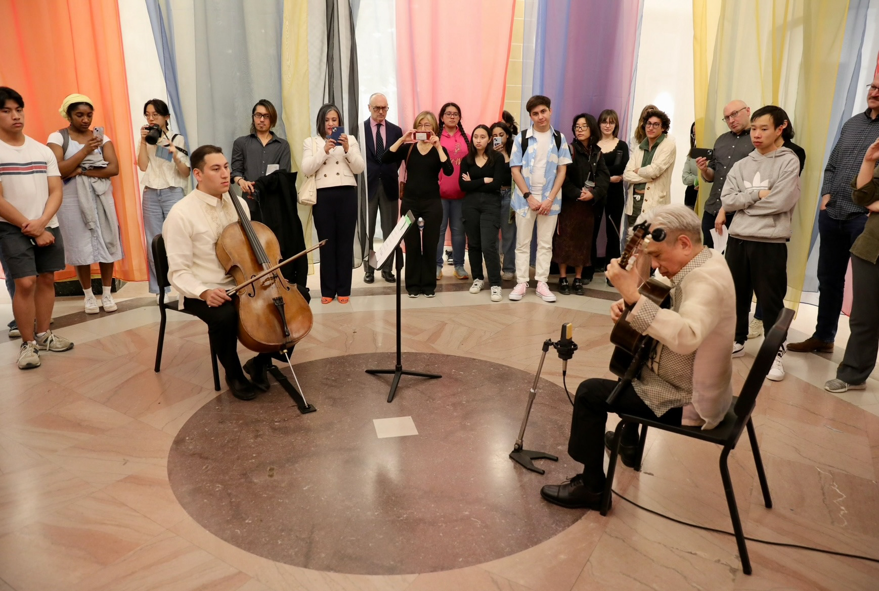 As you interact with this piece, think about how the various colors cast changing hues on each other, the built environment, and the people within it. How do they transform as you move them? How does your position change what they look like? How is your perception altered when others inhabit the space?